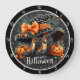 This charming Halloween illustration features a pair of sparkling black high heels and a witch hat with an orange bow and polka dots. They are placed between two glowing jack-o-lanterns against a dark, starry backdrop with a small spider. The banner 'Happy Halloween' completes this whimsical and festive circular design.
