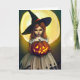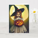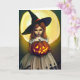 Happy Halloween card. A girl witch holding a Jack-o-lantern. Witch pun inside.