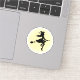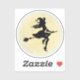 Image of a witch silhouette riding a broomstick in front of a glowing moon. The witch has long hair blowing in the wind, a pointed witch's hat, dressed in a skirt and high heel shoes.