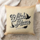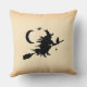 Halloween themed pillow with a vintage graphics of a witch, cat, broom and moon.