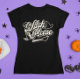Halloween themed coffee mug with a vintage graphics of a witch, cat, broom and moon.