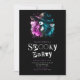 At the top of the invitation, a mesmerising witch commands attention, dressed in a striking black and green witch’s hat. Her hair flows in vibrant shades of pink and green, blending beauty with an unsettling creepiness that’s perfect for the Halloween season. The contrasting colours make her stand out as a central figure, adding both charm and mystery to the overall design.