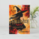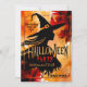On the back, the witch silhouette continues to provide a striking contrast against the fiery fall colours. The playful, cursive script at the top invites guests to a night of “hocus pocus and magical mischief.” Beneath, in a clear serif font, the location and RSVP details are provided, maintaining a balance between elegance and clarity. The overall design creates an inviting yet mysterious feel, perfectly suited for a Halloween-themed celebration..