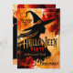 This invitation is fully editable, allowing users to replace names, dates, and other text to personalise it for their own event You can download the card to your mobile device or computer. This Halloween party invitation features a captivating blend of eerie and festive art with a warm autumnal colour palette of oranges, reds, and black. The front of the invitation shows the silhouette of a witch, defined by flowing hair and a tall, pointed hat with a buckle. The background is decorated with watercolor splashes and falling leaves, invoking the transition of the season. Bold typography with a mix of gothic and spooky font styles highlights the event date, time, and the hosts while a delicate border adds a vintage touch.