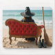 A witch in a wide-brimmed hat sits on a red velvet sofa facing the ocean waves, with a broom and a pair of boots lying on the sand beside her