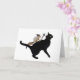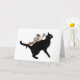 A little witch squirrel holding an acorn staff rides a black cat on this Halloween or Samhain card.