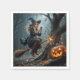 A witch riding a broom while texting on her cell phone collides with a tree near a glowing jack-o-lantern.