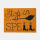 Get your home ready for trick-or-treaters or a Halloween bash! This door mat, designed by Aesthetic Journeys, features witch graphics with the words "stop in for a spell". Use the "customize it" button to change background colors.