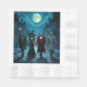 Halloween party paper napkins with ai art depicting a witch, vampire, mummy and zombie walking through Halloween night with a full moon in a cool comic book style.