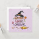 Playful Halloween greeting card featuring a witch hat, flying broom, and colourful candies. Perfect mix of cute and spooky for trick-or-treat lovers. Great for Halloween parties, candy lovers, and witchy fun.