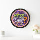 This fun Halloween clock design features a purple witch's hat at the top and says "WITCH WAY TO THE CANDY?" with a large orange question mark. Candy pieces are scattered around the bottom, and a spiderweb is in the top right corner. The clock face has a pink and white chequered border with numbers 1-12.
