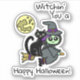 Kawaii cartoon hand drawn witch flying on a broom with a black cat and full moon in back with text saying, "Witchin you a Happy Halloween."