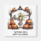 A backdrop of clouds and vibrant orange pumpkins. At the centre of it all, there's a cute little witch with a pointy hat and a mischievous blank stare that's more sweet than spooky. The pumpkins are neatly arranged around her, carved with friendly faces casting a soft, flickering light on her magical world.