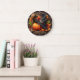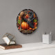 This festive clock features a detailed autumn scene with a large, black witch's hat placed on top of a pumpkin. A broom is propped up against the pumpkin, and the scene is decorated with various autumn leaves, berries, and smaller pumpkins. The clock face is set against a dark wooden background, with a banner at the bottom that reads "WELCOME". The clock hands are black and the numbers are stylised in a festive font, all framed by a wooden border.