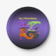 Witchy Halloween Paper Party Plates that features a bright Purple and Black gradient background with a Green witch's hand holding an eyeball over a cauldron of bubbling witches brew. In front of the witch cauldron there is a bright orange witch boot and a purple witch hat. Decorative text is Have a Witchy Halloween. Witchy Halloween Paper Party Plates are perfect for cake, appetizers, dinners, or salads at your Halloween party! If you need help customising this product, please contact me through my store and I'll be happy to help! Matching party supplies and party favours are also available in our shop.