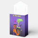 Witchy Halloween Favour Box that features a bright Purple and Black gradient background with a Green witch's hand holding an eyeball over a cauldron of bubbling witches brew.In front of the witch cauldron there is a bright orange witch boot and a purple witch hat. Text is Spooky Halloween Wishes 20XX. All text is customisable, you can add text, delete text, change font, text colour, move text, etc. Witchy Halloween Gift Box are great for your Halloween party favours! If you need help customising this product, please contact me through my store and I'll be happy to help! Matching party supplies and party favours are also available in our shop.