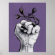 Witchy hand poster with an ink drawing depicting a hand in fist with sharp black fingernails and a black ring with evil monsters with sharp teeth over purple background. Fun creepy creepy illustration with a gothic feel.