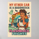 Add vintage charm to your Halloween decor with this hilarious 1950s-style illustration featuring a comic housewife and a mischievous mini monster wreaking havoc in her pristine kitchen. With muted mid-century colours and the cheeky phrase “My Other Car is a Broomstick,” this design blends spooky humour with nostalgic flair. Perfect for seasonal aprons, greeting cards, wall art, or kitchen accessories that celebrate domestic witchery with a wink.