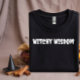 Halloween teacher T-shirt featuring white typography and a humourous phrase. This T-shirt is designed for teachers to wear during Halloween. The design includes the phrase "Witchy Wisdom" displayed in white typography. The shirt is intended to be a fun and lighthearted way for teachers to celebrate the Halloween season. The white text stands out on the T-shirt, making the message easily readable. The phrase "Witchy Wisdom" adds a touch of humour to the Halloween theme.