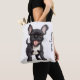 a delightful tote bag that showcases the embodiment of cuteness in the form of a charming, cartoon-style black French Bulldog puppy with a distinct white patch. The canvas of the tote bag is a clean and neutral colour that provides the perfect backdrop to make the puppy's features pop.