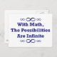 With Math, The Possibilities Are Infinite...This funny design is perfect for any math teacher or student with a mathematics major. Whether you're studying or teaching algebra, trigonometry, geometry, calculus, or simple addition and subtraction, this design is for you. See our shop for more unique and funny math shirts and gifts.
