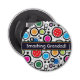 Bottle opener with Colourful pickleballs and black circles on white background. Perfect as a gift for a fashionable pickleball player.   Customisable text.