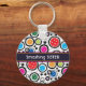 Keychain with Colourful pickleballs and black circles on white background. Perfect as a gift for a fashionable pickleball player. Customisable text.