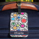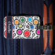 Luggage Tag with Colourful pickleballs and black circles on white background. Perfect as a gift for a fashionable pickleball player. Custom name on the bottom
