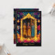 The front of the “Diwali Night Glow” greeting card is beautifully adorned with intricate and vibrant patterns. Surrounding the central photo frame are traditional Indian motifs such as detailed floral designs, peacock feathers, and lit oil lamps (diyas), which symbolise the light and joy of Diwali. The colours are predominantly rich and deep, with shades of black, gold, and hints of red and orange, creating a festive and elegant atmosphere.