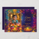 The Happy Diwali greeting card features a vibrant and ornate frame, surrounded by beautiful Diya lamps. The background is a rich royal blue, which contrasts beautifully with the warm hues of the flames. The Diya flames create a lively and festive atmosphere adding to the elegance of the design. The empty space on left in the centre is framed by a golden border intended for a custom picture . The overall style is celebratory inspired by traditional Indian designs, and is perfect for a festive occasion like Diwali. On the right there is a space for custom text. At the back, which is dark there is a space for Diwali wish or any extra message.