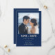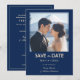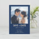 Turning the card over, the back showcases a solid navy blue background, providing a sleek and cohesive look. Here, you can include all the essential save the date information, such as names, venue details, and a personalised message. This ensures that your guests have everything they need in one elegant and inviting card.