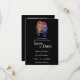 This enchanting card showcases a mesmerising watercolor artwork of two intricately depicted owls facing each other against a deep black background, surrounded by the vibrant colours of the LGBTQ+ pride flag. The owls symbolise the deep connection, unity, and celebration of love, making them the perfect choice for announcing your special day. At the top of the card, the words "Save the Date" are elegantly displayed, ensuring your guests mark their calendars for your upcoming event. Below this, your names are beautifully scripted, adding a personal touch to the invitation. The date of your wedding event is prominently showcased, ensuring your guests know exactly when to expect your invitation. Below the date, there is a customisable text space where you can include additional details about your wedding, such as the venue, dress code, or any special instructions.