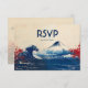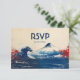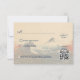 The front of the Japonesque Harmony with Fuji RSVP card beautifully showcases a serene Japanese scene. Mount Fuji majestically stands in the backdrop with calming blue and white tones, accompanied by gentle waves that exude a sense of tranquility. The soft beige and cream background with subtle red brushstrokes evokes the elegance of traditional Japanese ink wash paintings. The invitation is adorned with the words "RSVP" and the date, perfectly complementing the scene.