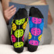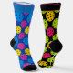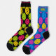 These socks are a riot of colour and contrast, like a disco ball collided with a paddle. One sock flaunts a blue base with pink, yellow, and blue polka dots (each with a cheeky black speck inside), while the other flips the vibe with a black base and green, pink, and yellow dots. They’re mismatched on purpose, like a pickleball rally between chaos and charm.