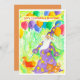 A colourful custom birthday party invitation featuring a whimsical wizard and his dog conjuring up a fun gift with colourful balloons illustrated with watercolor.