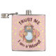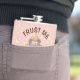 The flask itself is fine. It’s a cheap flask, obviously bought in bulk, however am prepared to overlook that. Given that it is a personalized item, I would have liked to have seen gift boxing instead of the generic packaging. Terrible printing, and/or quality. It’s a cheap, tacky vinyl. It is not cut straight and is also applied in a way that it is overhanging the bottom, causing the glue to catch on items and it will eventually roll and tear, damaging the wrap.