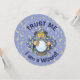 Old wizard with blue cape looking at crystal magic ball.