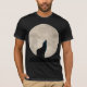 A black silhouette of a wolf with head raised up in the air howling at a very large full moon.