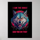 A vibrant illustration of a fierce wolf head with an intense and angry expression, complemented by the bold text "I am the wolf and you my prey."