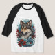 A majestic wolf's head surrounded by crashing waves and blossoming flowers.