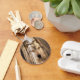 Wolf face photo layered onto a woodland photo with a ray of sunshine unique lupine key chain