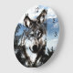 Wolf, or timberwolf, face layered onto a snowy mountain wilderness background with the background showing through parts of the wolf face to create a unique wall clock for wildlife lovers