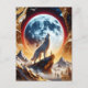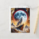 A white wolf stands on a rocky peak, howling at a large, blue moon with a red halo. The scene is set against a backdrop of snowy mountains and a distant forest.