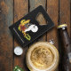 Wolf howling at a full moon with autumn leaves and acorns against a backdrop of black