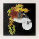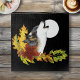 A wolf howling up at the full moon with autumn leaves and acorns against a backdrop of black,