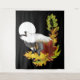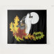 A wolf howling at a full moon with autumn leaves and acorns against a backdrop of black.