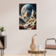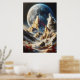 A wolf howls at the moon in a fantastical landscape of snow-capped mountains and glowing orbs. The large, blue moon fills the sky, casting an ethereal glow over the scene.
