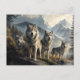 A pack of four wolves standing on a rocky ledge overlooking a misty mountain valley. The wolves are realistically rendered with detailed fur and expressions. The dominant wolf, standing in the foreground, stares directly at the viewer with a confident gaze. The other wolves are positioned behind and to the side, creating a sense of unity and strength. Perfect gift for wolf lovers.