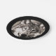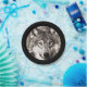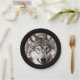 This paper plate is designed with a gray wolf in the center and accented with a black trim.