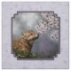A cute wolf pup sniffs some pink spring apple blossoms. Accented with a matching lavender purple background.